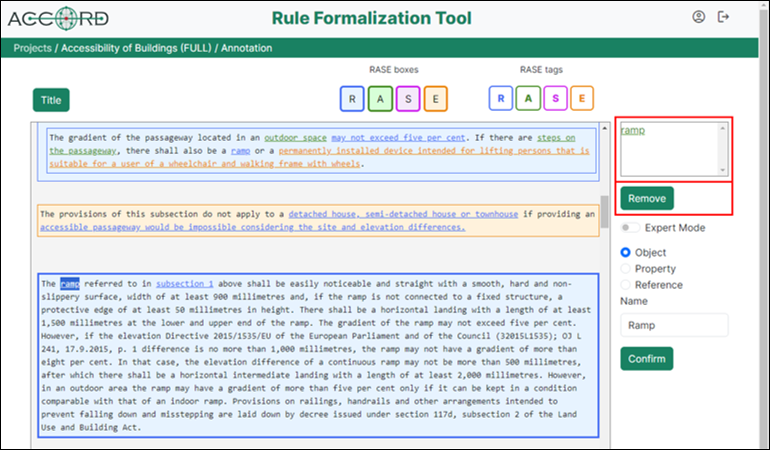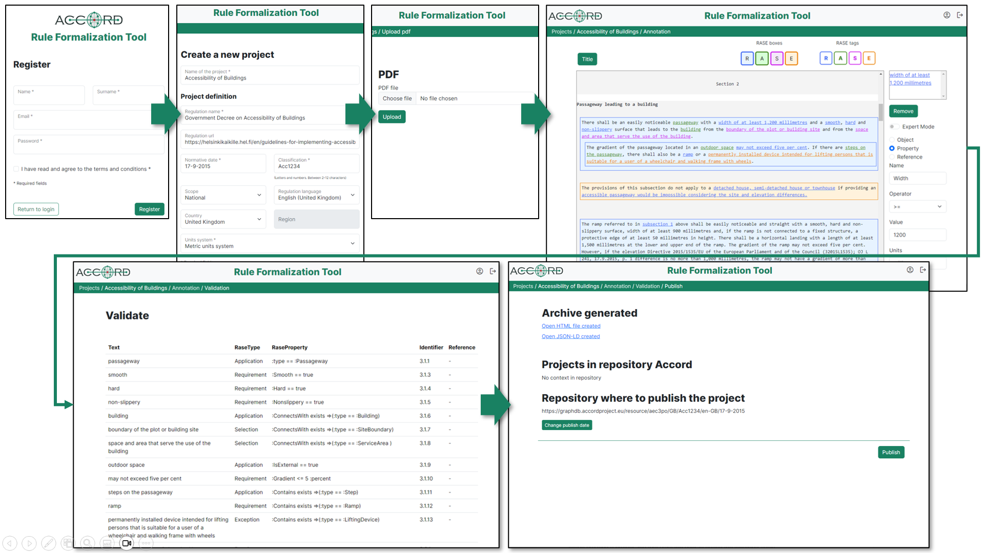 The rule formalisation tool has been implemented as a web application where users can register and create projects for each regulation to be transformed into machine-processable format. The usual data such as name, surname, email address, etc. are requested during registration. Once registered, the user can begin to perform several actions to carry out rule formalisation process for one or more regulations.