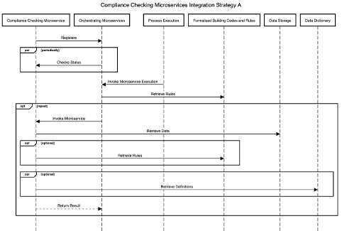 Integration Strategy A: This integration strategy makes use of the Orchestrating Microservices component. In this case, the Orchestrating microservices component parses the rules provided by the building codes and rules repository and invokes one or more microservices to complete compliance checking. It is also responsible for integrating the results of the compliance checking from these microservices into a result. The sequence diagram for this execution strategy is shown in below:
