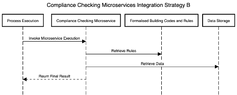 Integration Strategy B: This integration strategy bypasses the Orchestrating Microservices component and instead invokes a single microservice to perform the entire compliance checking process for a given building code. This microservice will be responsible for parsing the BCRL, fetching data and performing all required compliance checks before returning results to the process execution component. The sequence diagram for this execution strategy is shown below: